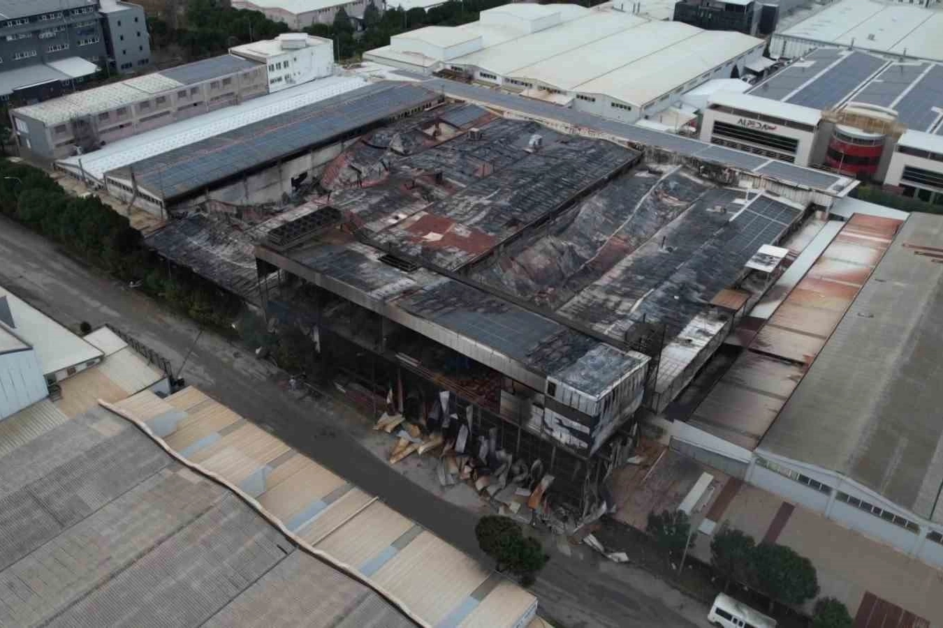 Dron ile kaydedilen görüntülerde, otomotiv sektörüne yönelik metal yüzey işlem proseslerinin yürütüldüğü fabrikanın tamamen kullanılamaz hale geldiği görüldü.