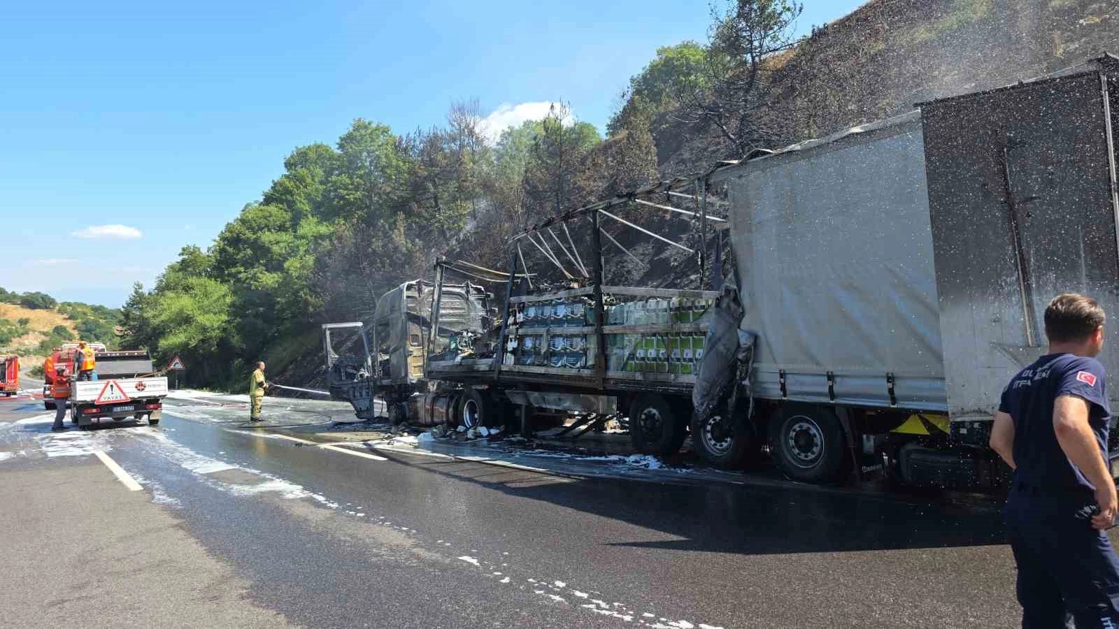 Kısa sürede büyüyen yangın, tırı tamamen sardı. Alevler çevredeki ormanlık alana da sıçrarken, olay yerine çok sayıda itfaiye ekibi sevk edildi. Tırdaki yangın ekiplerin müdahalesiyle kontrol altına alınırken, ormanlık alandaki yangın ise yaklaşık yarım saatlik yoğun çalışmanın ardından söndürüldü.