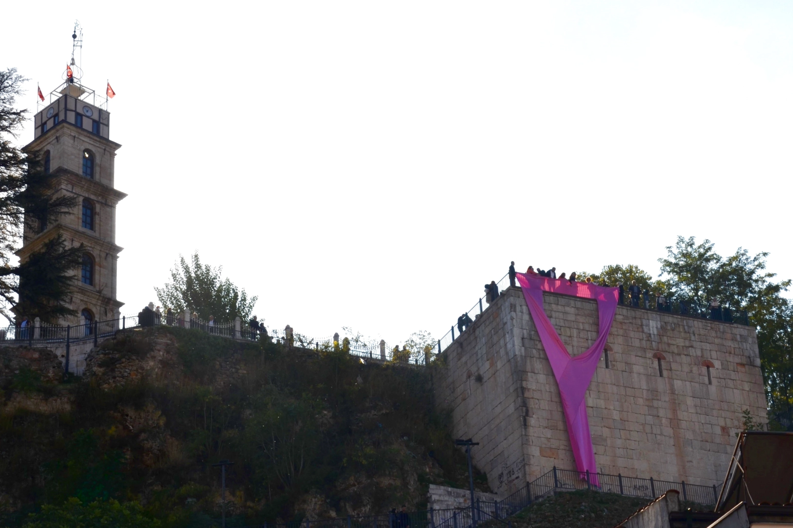 Tophane surlarına ‘Pembe kurdele’ asıldı Konuşmaların ardından sağlık çalışanları ve öğrenciler, meme kanserinin simgesi olan dev ‘pembe kurdeleyi’ Bursa’nın birçok noktasından görülebilecek olan Tophane surlarına astılar. ‘Pembe Kurdele’nin toplumsal bilinç oluşturmak amacıyla ay sonuna kadar şehrin farklı noktalarında asılı kalacağı bilgisi verildi.