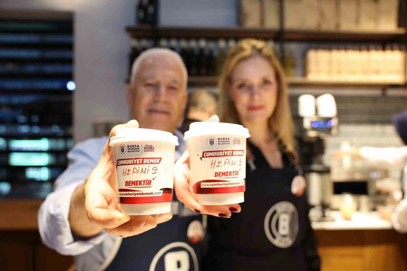 Eşi Seden Bozbey ile birlikte barista önlüklerini giyen Başkan Bozbey, Cumhuriyetin 102. yılına özel olarak hazırlanan ‘Cumhuriyet Demek’ temalı bardaklarda içecek ikramında bulundu. Vatandaşların isimlerini ‘Cumhuriyet demek’ temalı bardaklara yazan Başkan Mustafa Bozbey ve eşi Seden Bozbey, Atatürk’ün emanet ettiği Cumhuriyet’in sıcaklığını Bursalılarla birlikte paylaştı. Bu sene kutlamaların teması olan ‘Cumhuriyet demek, hepimiz demek’ sloganını da yazarak ikramda bulunan Başkan Bozbey ve eşi Seden Bozbey, kahve keyfini vatandaşlarla birlikte yaşadı.