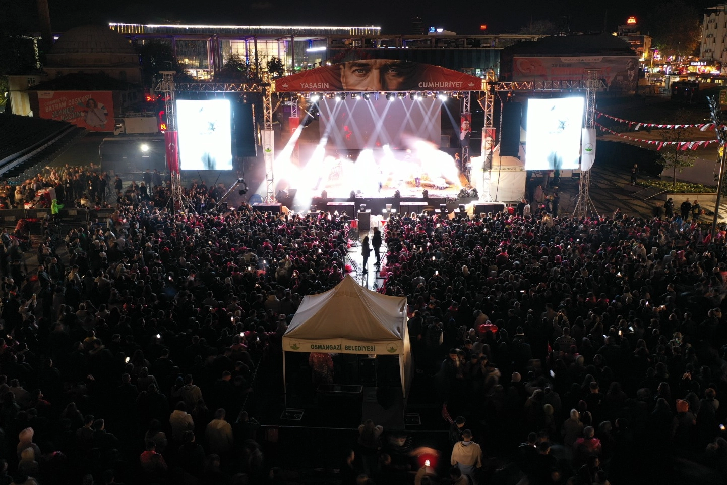 “Cumhuriyet’in Bize Kazandırdıklarıyla Yaşamayı Sürdüreceğiz” Konseri vatandaşlarla birlikte izleyen Osmangazi Belediye Başkanı Erkan Aydın, “Cumhuriyet Bayramı coşkusunu kalplerimizin en güzel yerinde, hep birlikte paylaşmak üzere hepiniz hoş geldiniz. Yağmura ve soğuğa rağmen, bu meydanı dolduran sizlerin varlığı, Cumhuriyet’e olan sevdamızın en güçlü göstergesidir. Biz şikayet etmiyoruz. Çünkü biliriz ki, yağmur berekettir, umuttur, gelecektir. Bu akşam da, Cumhuriyetimizin 102’nci yılını Zeynep Bastık konseriyle hep birlikte kutluyoruz. Burada Cumhuriyetine sahip çıkan, geleceğine umutla bakan, asla geri adım atmayan gençleri görüyorum. Gökyüzü ağlamadan gökkuşağı görülmez. Güzel günler çok yakın. Bugünleri hep birlikte geçecek, yarınların güneşli günlerine hep birlikte yürüyeceğiz. Cumhuriyet’in bize kazandırdığı faziletlerle, erdemle, onurla ve umutla yaşamayı sürdüreceğiz. Bize bu onurlu yaşam hakkını armağan eden Büyük Önder Gazi Mustafa Kemal Atatürk ve silah arkadaşlarını rahmet, minnet ve saygıyla anıyorum. O halde, yaşasın Cumhuriyet. Nice 102 yıllara” dedi.