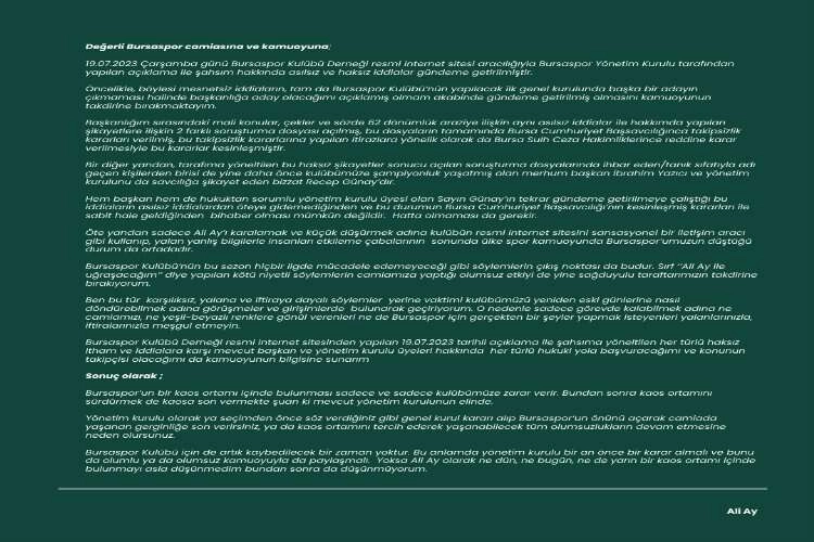 Bursaspor’a tekrar başkan adaylığını açıklayan Ali Ay, mevcut yönetimin kendisi hakkında yaptığı açıklamalara sert cevap erdi. Ay, “Ali Ay olarak ne dün, ne bugün, ne de yarın bir kaos ortamı içinde bulunmayı asla düşünmedim, bundan sonra da düşünmüyorum” dedi.Ali Ay’ın açıklaması şöyle:"19.07.2023 Çarşamba günü Bursaspor Kulübü Derneği resmi internet sitesi aracılığıyla Bursaspor Yönetim Kurulu tarafından yapılan açıklama ile şahsım hakkında asılsız ve haksız iddialar gündeme getirilmiştir. Öncelikle, böylesi mesnetsiz iddiaların, tam da Bursaspor Kulübü’nün yapılacak ilk genel kurulunda başka bir adayın çıkmaması halinde başkanlığa aday olacağımı açıklamış olmam akabinde gündeme getirilmiş olmasını kamuoyunun takdirine bırakmaktayım. Başkanlığım sırasındaki mali konular, çekler ve sözde 62 dönümlük araziye ilişkin aynı asılsız iddialar ile hakkımda yapılan şikayetlere ilişkin 2 farklı soruşturma dosyası açılmış, bu dosyaların tamamında Bursa Cumhuriyet Başsavcılığınca takipsizlik kararları verilmiş, bu takipsizlik kararlarına yapılan itirazlara yönelik olarak da Bursa Sulh Ceza Hakimliklerince reddine karar verilmesiyle bu kararlar kesinleşmiştir.Bir diğer yandan, tarafıma yöneltilen bu haksız şikayetler sonucu açılan soruşturma dosyalarında ihbar eden/tanık sıfatıyla adı geçen kişilerden birisi de yine daha önce kulübümüze şampiyonluk yaşatmış olan merhum başkan İbrahim Yazıcı ve yönetim kurulunu da savcılığa şikayet eden bizzat Recep Günay’dır. Hem başkan hem de hukuktan sorumlu yönetim kurulu üyesi olan Sayın Günay’ın tekrar gündeme getirilmeye çalıştığı bu iddiaların asılsız iddialardan öteye gidemediğinden ve bu durumun Bursa Cumhuriyet Başsavcılığı’nın kesinleşmiş kararları ile sabit hale geldiğinden bihaber olması mümkün değildir. Hatta olmaması da gerekir. Öte yandan sadece Ali Ay’ı karalamak ve küçük düşürmek adına kulübün resmi internet sitesini sansasyonel bir iletişim aracı gibi kullanıp, yalan yanlış bilgilerle insanları etkileme çabalarının sonunda ülke spor kamuoyunda Bursaspor’umuzun düştüğü durum da ortadadır.”“Her türlü hukuki yola başvuracağım”Ali Ay ayrıca, “Bursaspor Kulübü’nün bu sezon hiçbir ligde mücadele edemeyeceği gibi söylemlerin çıkış noktası da budur. Sırf ’Ali Ay ile uğraşacağım’ diye yapılan kötü niyetli söylemlerin camiamıza yaptığı olumsuz etkiyi de yine sağduyulu taraftarımızın takdirine bırakıyorum. Ben bu tür karşılıksız, yalana ve iftiraya dayalı söylemler yerine vaktimi kulübümüzü yeniden eski günlerine nasıl döndürebilmek adına görüşmeler ve girişimlerde bulunarak geçiriyorum. O nedenle sadece görevde kalabilmek adına ne camiamızı, ne yeşil-beyazlı renklere gönül verenleri ne de Bursaspor için gerçekten bir şeyler yapmak isteyenleri yalanlarınızla, iftiralarınızla meşgul etmeyin. Bursaspor Kulübü Derneği resmi internet sitesinden yapılan 19.07.2023 tarihli açıklama ile şahsıma yöneltilen her türlü haksız itham ve iddialara karşı mevcut başkan ve yönetim kurulu üyeleri hakkında her türlü hukuki yola başvuracağımı ve konunun takipçisi olacağımı da kamuoyunun bilgisine sunarım” İfadelerini kullandı.“Kaos ortamı içinde bulunmayı asla düşünmedim”“Sonuç olarak; Bursaspor’un bir kaos ortamı içinde bulunması sadece ve sadece kulübümüze zarar verir” diyen Ali Ay, “Bundan sonra kaos ortamını sürdürmek de kaosa son vermekte şuan ki mevcut yönetim kurulunun elinde. Yönetim kurulu olarak ya seçimden önce söz verdiğiniz gibi genel kurul kararı alıp Bursaspor’un önünü açarak camiada yaşanan gerginliğe son verirsiniz, ya da kaos ortamını tercih ederek yaşanabilecek tüm olumsuzlukların devam etmesine neden olursunuz. Bursaspor Kulübü için de artık kaybedilecek bir zaman yoktur. Bu anlamda yönetim kurulu bir an önce bir karar almalı ve bunu da olumlu ya da olumsuz kamuoyuyla da paylaşmalı. Yoksa Ali Ay olarak ne dün, ne bugün, ne de yarın bir kaos ortamı içinde bulunmayı asla düşünmedim bundan sonra da düşünmüyorum” şeklinde söylemde bulundu.