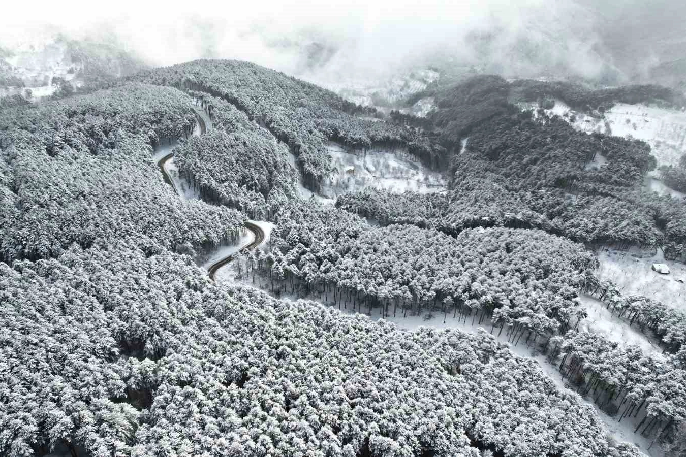 Kış mevsiminin etkisiyle beyaza bürünen ormanlık alanlar arasında ilerleyen yollar, havadan çekilen görüntülerde kartpostallık kareler oluşturdu.