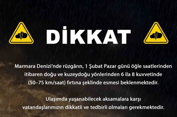 Bursa Valiliği'nden yapılan açıklamada, beklenen fırtına nedeniyle deniz ulaşımında aksamalar yaşanabileceğini belirterek vatandaşların dikkatli ve tedbirli olmaları konusunda uyarıda bulunuldu.