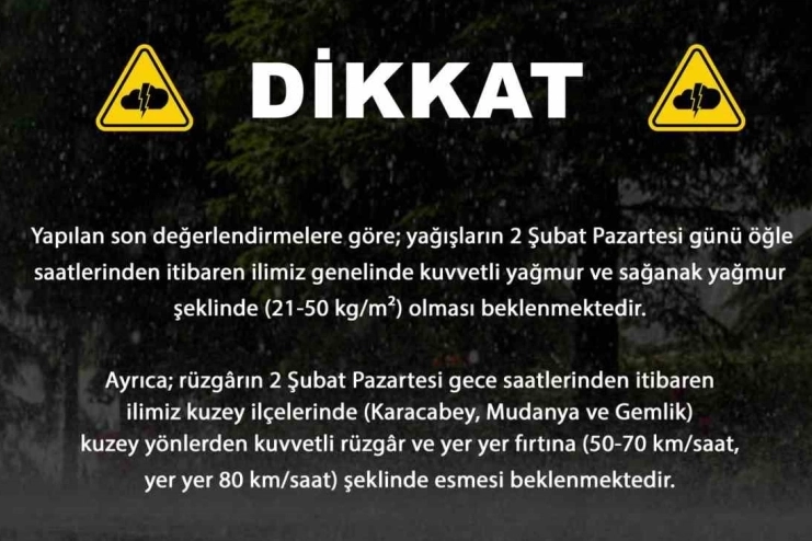 Yapılan son meteorolojik değerlendirmelere göre 2 Şubat Pazartesi günü öğle saatlerinden itibaren Bursa genelinde kuvvetli yağmur ve sağanak yağış bekleniyor.