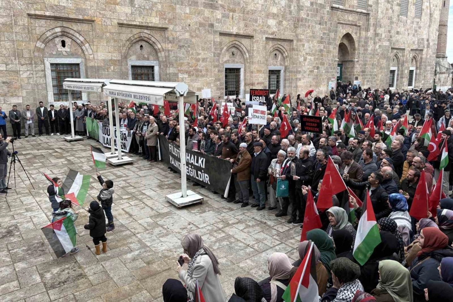 Bursa Ulu Camii önünde toplanan platform üyeleri ve vatandaşlar Filistin için çağrıda bulundu.