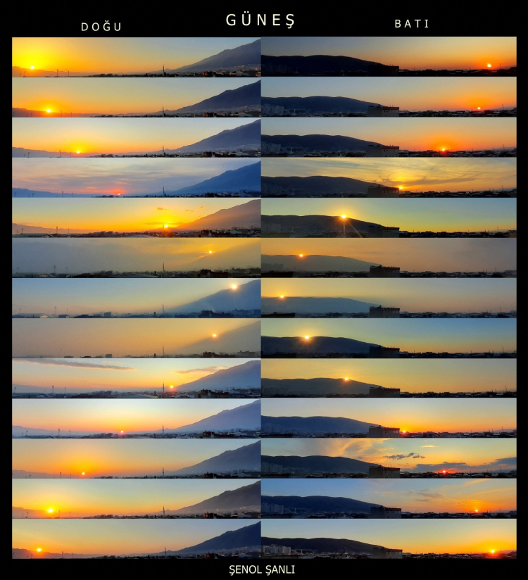 Gökyüzü meraklısı Şenol Şanlı, 1 yıl boyunca her ay doğu ve batı ufuklarından çektiği güneş fotoğraflarını tek karede birleştirerek kış ve yaz gündönümleri arasındaki hareketi gözler önüne serdi.