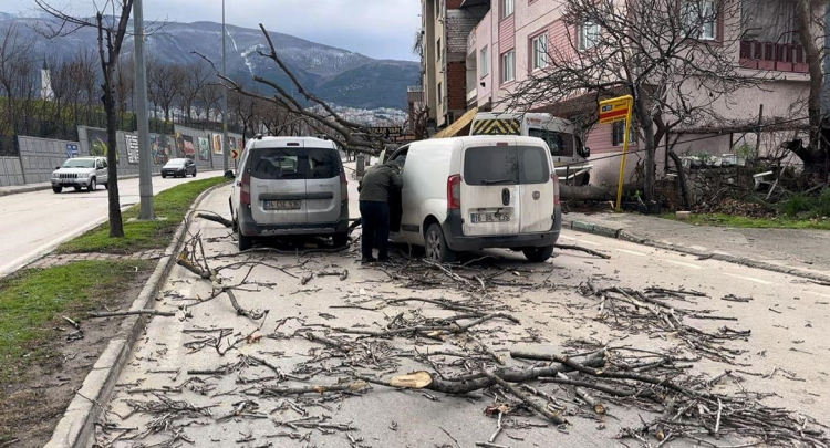 Kent merkezinde hızı 75 kilometreye ulaşan rüzgar nedeniyle, Osmangazi ilçesi Zafer Mahallesinde cadde üzerine devrilen ağaçlar, seyir halindeki hafif ticari iki aracın üzerine düştü.