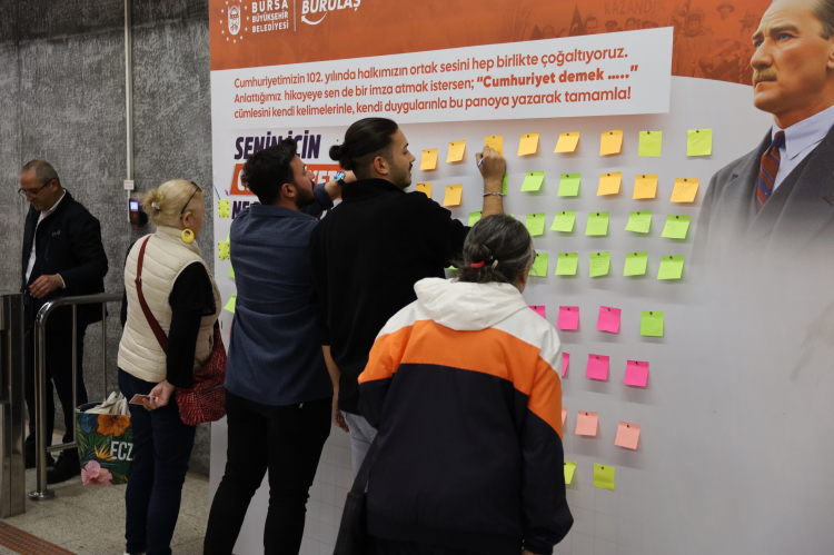Bursa Büyükşehir Belediyesi’nin Cumhuriyet’in 102. yılına özel olarak başlattığı ‘Cumhuriyet demek’ kampanyası, 7’den 70’e herkesten büyük ilgi görürken; Başkan Mustafa Bozbey de kampanyaya ‘Cumhuriyet demek, hepimiz demek" sloganını yazarak katıldı.