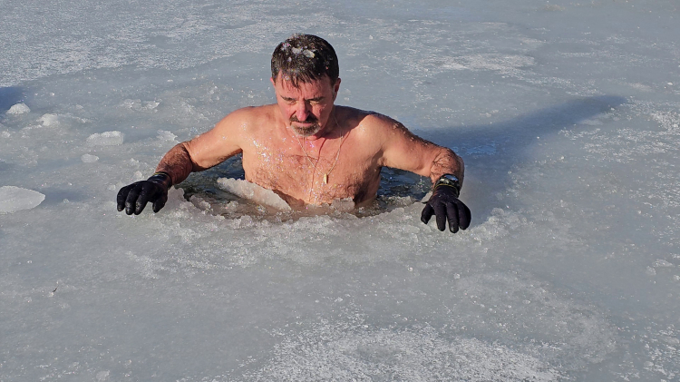 Şentürk, bu yıl da önce çökertme oynadığı Keles Baraklı Göleti'nin üzerini kaplayan kalın buz tabakasını kesip açtığı alandan buz gibi suya girdi.
