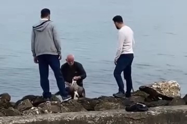 Martının su üzerinde hareketsiz şekilde çırpınmaya çalıştığını gören vatandaş, hiç tereddüt etmeden kıyafetleriyle birlikte denize girerek martıyı güvenli bir alana çıkardı.