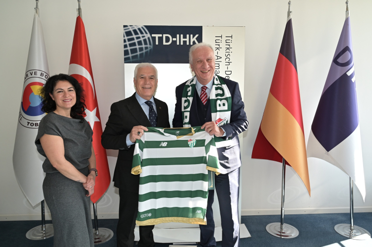 Türk-Alman Ticaret ve Sanayi Odası Genel Sekreteri Okan Özoğul’u ve Türk-Alman İşverenler Derneği Başkanı Remzi Kaplan’ı da ziyaret eden Başkan Mustafa Bozbey, yapılabilecek iş birlikleri hakkında fikir alışverişinde bulunurken Bursaspor forması ve atkısı hediye etti.