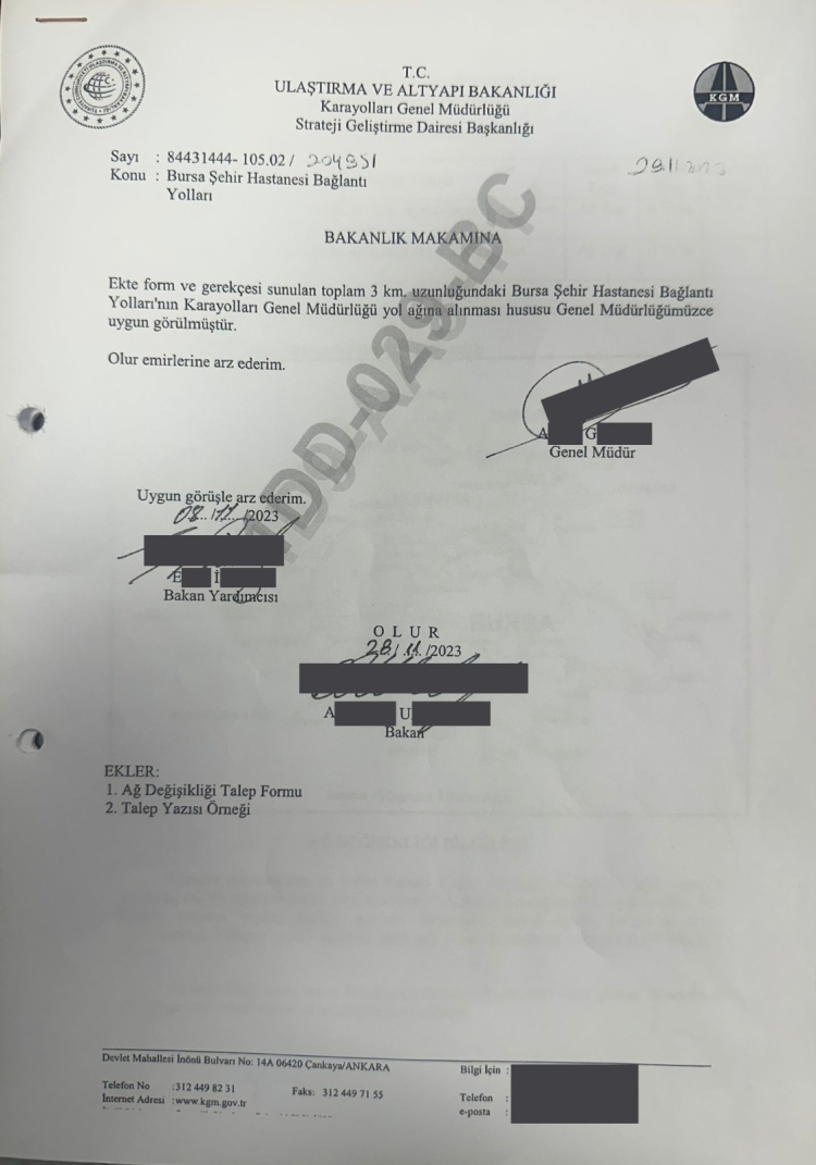 • 07.07.2023 tarihli ve 121197 sayılı yazı ile dönemin Belediye Başkanı tarafından yolun Karayolları ağına alınması resmi olarak talep edilmiştir.