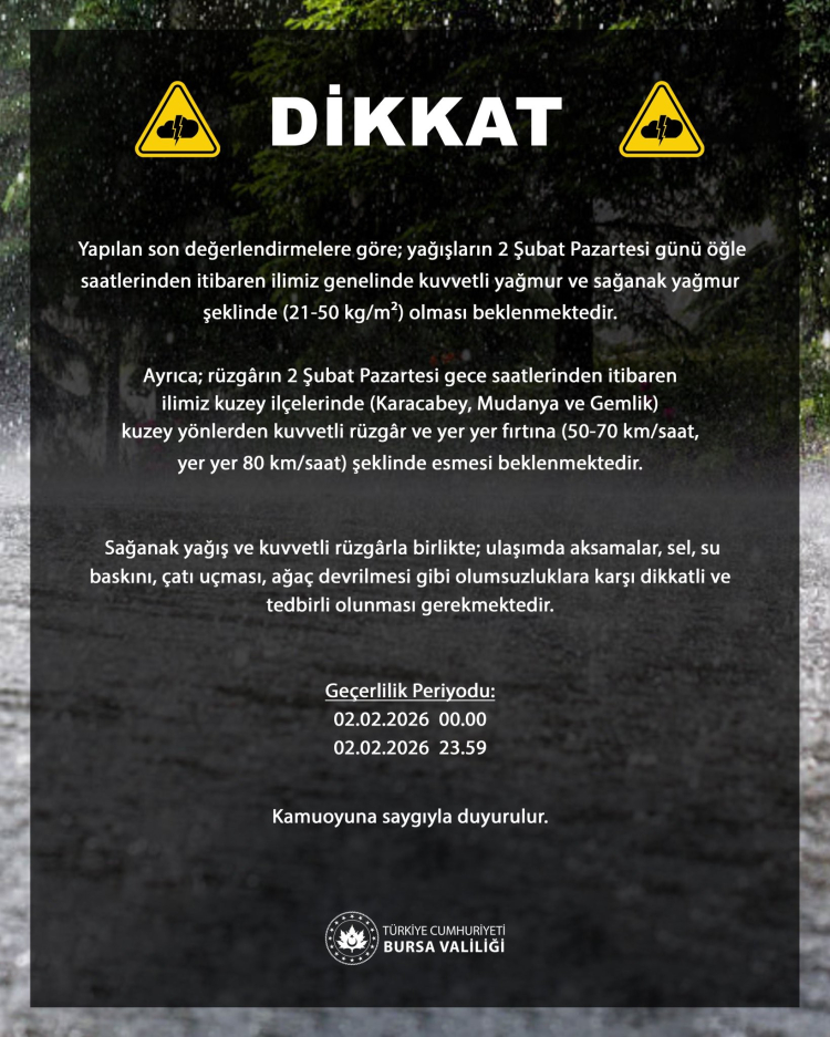 Yapılan son meteorolojik değerlendirmelere göre 2 Şubat Pazartesi günü öğle saatlerinden itibaren Bursa genelinde kuvvetli yağmur ve sağanak yağış bekleniyor.