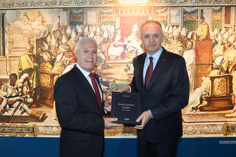 Başkan Bozbey, Bakan Yardımcısı Gökhan Yazgı ve Kültür Varlıkları ve Müzeler Genel Müdürü Birol İnceciköz’e günün anısına ‘Dede Korkut’ kitabı hediye etti.