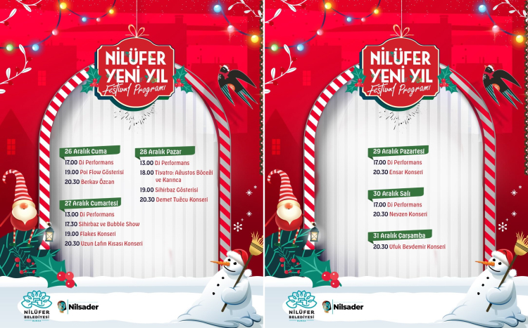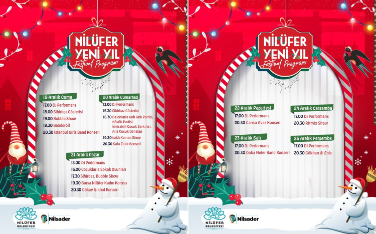 Nilüfer Belediyesi, 19-31 Aralık tarihleri arasında düzenleyeceği "Nilüfer Yeni Yıl Festivali" kente yılbaşı coşkusunu getirecek. Her gün farklı konserlerin, gösterilerin ve alışveriş stantlarının yer alacağı festival, 31 Aralık gecesi sevilen sanatçı Ufuk Beydemir’in konseriyle final yapacak.